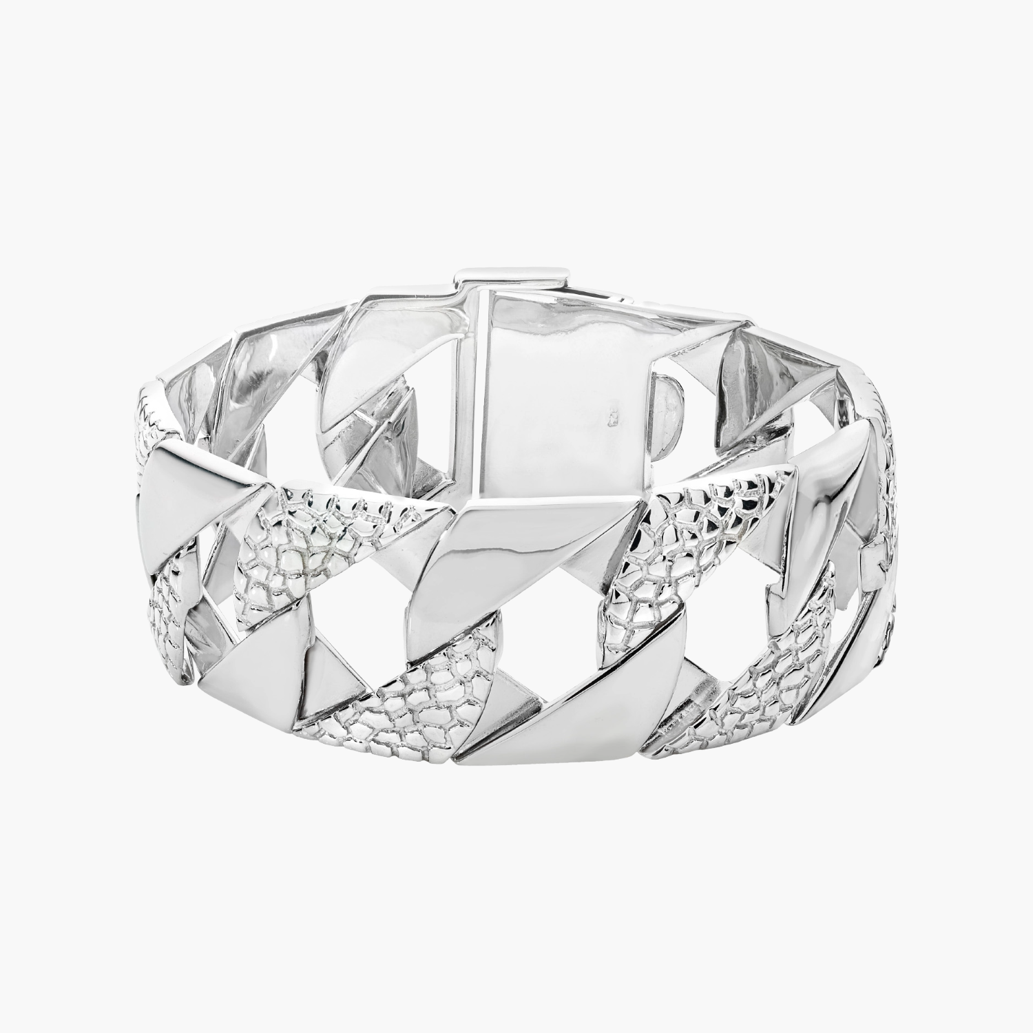 Featuring a unique polished and textured link pattern, this design catches the light from every angle, giving it a striking, high-end finish. The bracelet is made from solid 925 sterling silver and secured with a robust, easy-use clasp for everyday confidence.