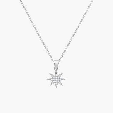 Radiate brilliance with this stunning Sterling Silver Starburst Necklace. Crafted from high-quality 925 sterling silver, the pendant features an eight-point starburst design, encrusted with dazzling cubic zirconia stones that shimmer beautifully under any light.