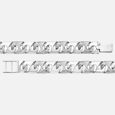 Our Sterling Silver Patterned Mariner Chain, a masterpiece of craftsmanship and style. Expertly designed, this exquisite chain is a must-have accessory that seamlessly blends classic charm with modern sophistication.